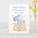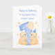 This blue 1st birthday card is suitable for twin boys. The design includes two watercolour teddy bears hugging a polka dot number 1, party hat, balloon and stars.
