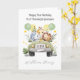 This watercolour 1st birthday card is suitable for a boy or girl. The design includes birthday stars, green and yellow birthday balloons, and a safari car with an elephant, giraffe and lion inside. All text is fully customisable.