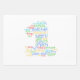 1st birthday wrapping paper designed with lots of birthday related words arranged into the shape of a 1 in a friendly colourful theme aimed for kids