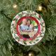 Customise this elegant 2-photo 2-sided first Christmas as great grandparents ornament features a festive red and green holly and berry Christmas wreath with your own photo with your grandchild with the text "Our First Christmas as Grandparents" on the front with the year. Back of the photo features another photo and the name of your first grandchild and the year. This is great for the great grandma and grandpa and a way to start your great grandchild's yearly tradition of receiving a personal keepsake ornament each Christmas.