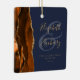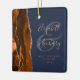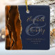 This elegant modern ornament features a burnt orange watercolor agate design trimmed with faux gold glitter. Easily customise the gold-coloured text on a navy blue background, with the names of the bride and groom in whimsical handwriting calligraphy over a large ampersand. The words "First Christmas Married" appear in serif font along with the customisable year.