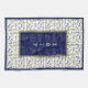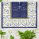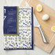 2017 calendar blueberries border kitchen tea towel has "Blueberries on Vine" leaves and stems from blueberry bush, art by Kristie Hubler, with colours white, dark blue, blue, greens, and olive green.
