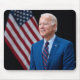 The photograph captures a moment in 2021 of President Joe Biden, image is now one of his official US Presidential photo. Sunlight streams through a window, casting a warm glow on the figure of an Biden standing confidently in the centre of the frame. His arms are crossed, a gesture that suggests both authority and a hint of casual ease. --- Mr. Biden is dressed impeccably in a blue suit, the crisp fabric contrasting sharply with the clean lines of his white shirt. A blue and red striped tie adds a touch of personality to the ensemble. --- A glimpse of patriotism is evident in the background. An American flag stands proudly on a pole to the man's left, its vibrant colours a bold contrast to the solid black behind Joe. A closer look reveals a painting hanging on the wall, adding a touch of personal flair to the professional atmosphere. --- President Biden is the focal point of the image. His short white hair frames a kind face, etched with the lines of a life well-lived. A warm smile plays on his lips, conveying a sense of confidence, wisdom, and perhaps a hint of amusement.