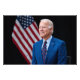The photograph captures a moment in 2021 of President Joe Biden, image is now one of his official US Presidential photo. Sunlight streams through a window, casting a warm glow on the figure of an Biden standing confidently in the centre of the frame. His arms are crossed, a gesture that suggests both authority and a hint of casual ease. --- Mr. Biden is dressed impeccably in a blue suit, the crisp fabric contrasting sharply with the clean lines of his white shirt. A blue and red striped tie adds a touch of personality to the ensemble. --- A glimpse of patriotism is evident in the background. An American flag stands proudly on a pole to the man's left, its vibrant colours a bold contrast to the solid black behind Joe. A closer look reveals a painting hanging on the wall, adding a touch of personal flair to the professional atmosphere. --- President Biden is the focal point of the image. His short white hair frames a kind face, etched with the lines of a life well-lived. A warm smile plays on his lips, conveying a sense of confidence, wisdom, and perhaps a hint of amusement.