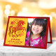 Bold, graphic “Happy New Year” typography in both Chinese and English and a stunning visual of an elegant red faux foil rabbit with flowers, clouds and stars, overlay a traditional yellow circle pattern and brushed red foil border on the front. On the inside, a red cloud and star visual, along with your personal message, overlay a white background with a brushed red faux foil border. Feel the warmth and joy of the holiday season whenever you send this stylish yet modern, personalised 2023 Chinese New Year of the Rabbit folded greeting card. Make sure someone special receives this greeting!