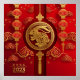 2023 is the Chinese New Year of the Rabbit! Design features gold rabbit on red with lanterns and clouds.
