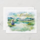 2023 Exercise Patience! JW Convention postcard. Watercolor style picture of a man fishing in a beautiful lake with mountain in far background.