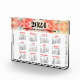 A horizontal clear acrylic block features a 2024 year-at-a-glance calendar with the months and your business information over a colourful kaleidoscope print at the top. Perfect for your desk or give to customers and clients.