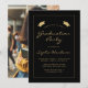 This classic, modern graduation party invitation features gold-coloured text in a thin gold rectangular border on a black background. The word "Graduation" and the name of the graduate appear in casual modern handwriting font beneath a pair of gold mortar board caps. Customise the invitation with party details, and replace the sample image on the back with a photo of your grad.