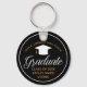 This chic black and gold custom senior graduate keychain features classy white typography under a high school or college name for the class of 2024. Customize with your graduating year under the elegant calligraphy for a great personalized graduate key chain gift.