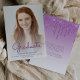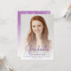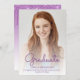 Trendy modern graduation announcement featuring a custom vertical photo. The word "Graduate" appears in purple handwriting script overlay, with the graduate's name, school and year of graduation below in sans serif font. Easily replace the sample image with your own graduate's photo. A white gradient screen helps ensure the text pops. Add details about your graduate's accomplishments and future plans on the reverse, which features a purple dripping faux glitter border on an ombre background.