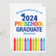 This adorable 2024 preschool graduation card features a cool grad cap above colourful writing and a row of crayons in rainbow. Cute customisable Pre-K graduate congratulations card in fun colours for your preschooler with your kid's name personalised in blue. Congratulations to our PreK grad!