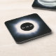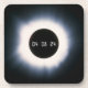 Artistic Image of a total solar eclipse in black and white dated April 8, 2024, showing the bright glow of the sun’s corona radiating from behind the blocking image of the full moon.