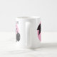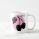 Cherry woodcut design on pink circle on white mug.