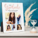 Simply stylish graduation plaque sign with easel features "2025 Graduate" in a trendy rose gold / blush pink calligraphy script with a modern photo collage of four (4) senior portrait pictures of the grad.