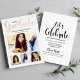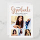 Simply stylish white graduation announcement card and party invitation features "Graduate" in a trendy real foil calligraphy script with a modern photo collage of four (4) photos of the grad. Two-sided card design includes "Let's Celebrate" graduation party wording and details on the back. Classic black and white design with rose gold foil coloured accents.