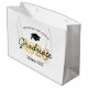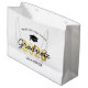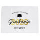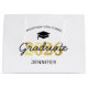 Custom graduation gift bag featuring a graduate cap, 2025 in faux gold, school name, students name, and the word graduate in a script font.