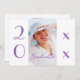 Create the perfect minimal, modern, customisable graduation invitations. Replace the sample photo with your own. The wide white borders on either side contain 20 on the left and XX on the right in large violet script text for the graduation class year which you can customise. The stylish violet watercolor script text that overlays the photograph on the front reads, "Graduate." The white back of the invite features the word "celebrate" in a pale purple watercolor script font. Replace the violet and black sample text on the back for your graduate and event. Personalise it for any graduate: high school, college, graduate school, law school, medical school, trade school.