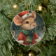 Cute 2025 ornament with a little mouse, all dressed up for the holidays in his Santa outfit and green scarf. The back of the ornament is red and green with a white snowflake.