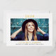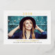 Two-sided card design features a simple real gold foil high school graduation announcement on the front with an invitation to a graduation open house party on the back. Personalise the front with a landscape format senior photo and customise the modern black text with the class year, graduate's name, and school they are graduating from. Include all of the important party details on the back. Minimalist style design features an accent stripe on the front.