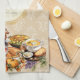 Customizable 2025 calendar towel. Soup tureen & dinner dishes. Tan damask background with mealtime grace. "Bless Us, O Lord and