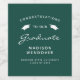 Celebrate your graduate's milestone in style with these custom graduation wine bottle labels, featuring the words "Congratulations to our Graduate" in white text on a dark green background, decorated by a pair of white mortar board caps. The word "Graduate" appears in a graceful handwriting-style script. Personalise it with the grad's name, school, and year of graduation.