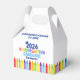 This customized 2026 kindergarten graduation party favor box features a cool grad cap above colorful writing and a row of crayons in rainbow. Cute kindergartner graduate design in fun colors for the last day of elementary school. Congratulations to our kinder graduates!