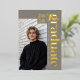 This stone gray photo graduation announcement features a clean, modern layout with real gold foil accents. The customizable template allows you to personalize the final two digits of the class year, the graduate’s name, and school, and upload two photos. Adjustable letter spacing lets you fully justify the vertical name and school text for a precise, custom fit. The year and “graduate” are printed in genuine gold foil, while the name and school are digitally printed in ivory for crisp contrast. A streamlined graduation announcement designed for seniors who prefer a modern look with metallic detail. © Kimbellished, LLC