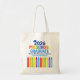 This customizable 2026 preschool graduation tote bag features a cool grad cap above colorful writing and a row of crayons in rainbow. Cute PreK graduate party keepsake gift in fun colors with your custom personalization. Congratulations to our Pre-K graduates!