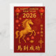 The front of the card showcases “Happy Chinese New Year 2026” alongside the Chinese phrase 馬到成功 (“Success Arrives with the Horse”), while the back of the card offers a refined red and gold greeting with the Chinese characters 新年快乐 (“Happy New Year”).