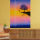 Acrylic on raw canvas painting. Created as a hand-painted t-shirt design first in the summer of 1989 in the park I used to set up in by the sundial overlooking Great Harbour in Woods Hole, Ma. I took a day off and catching a ride on a friends sailboat over to Martha's Vineyard for the day i rode my bike to the other side of the island to the beach at Katama and as i was walking passed this young brother wearing a grey t -shirt i happened to notice the little silk-screened design on his breast pocket was a black silhouette on a yellow/orange background of someone fishing. Realised what made that design work was the contrast of the yellow/orange and black of the silhouette so i determined to use that same element to express that which i've always been most passionate about.: learning to fly! The next day i painted the first attempt using these elements called "dancin' man?" which was the same design but from the view point of being behind the man on the edge. A few days later i created Learning to Fly, then the Bluedge or nightime version then Daedulus. "Learnin' to fly" became the most popular image i've ever done and it wasn't until 2007 nearly 19 years later when i started to learn how to fly via a computer flight simulator that i realised i should probably do a piece about how important learning to land is to learning to fly.
