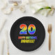 This cheerful, colourful, and fun birthday-themed paper plate design features a large number "20" and the message "HAPPY BIRTHDAY,", both coloured with a rainbow spectrum gradient inspired pattern, along with a bold yellow customisable name. The background is coloured black. Fun, customised paper plates like this might be used at a birthday celebration being held in honour of somebody’s twentieth birthday. [~Z0000488]