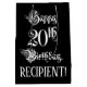 This elaborate and elegant birthday gift bag design features the message “Happy 20th Birthday,” in luxurious script style text, on a black coloured background. It also features an editable recipient name. A fancy gift bag like this might be used when giving a gift or present in honour of somebody’s twentieth birthday. [~Z0000557]