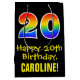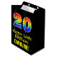 This fun, exciting, and colourful birthday-themed giftbag design features a large number "20" with a rainbow spectrum gradient style pattern, along with the message "Happy 20th Birthday,", and a custom recipient name. It also has a black-coloured background. A fun giftbag like this might be used when wrapping presents being given to somebody in celebration of their twentieth birthday. [~Z0000512]