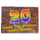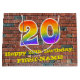 This fun and vibrant birthday themed gift bag design, inspired by graffiti and urban art, features a large number "20" having a rainbow spectrum gradient inspired pattern. It also features the message "Happy 20th Birthday,", and a custom name. The background features a brick wall style pattern. A colourful birthday themed gift bag like this might be a fun way to wrap a gift or present being given to somebody who is celebrating their twentieth birthday. [~Z0000522]