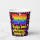 This happy and fun birthday themed paper cup design features a large number “20” having a rainbow spectrum gradient inspired pattern. It also features the message “Happy 20th Birthday,”, and a custom name. The background features a pattern of heart shapes with colours like pink, red, and purple. Upbeat, loving paper cups like this might be fun to have at a birthday celebration/party being held in celebration of somebody’s twentieth birthday. [~Z0000548]
