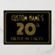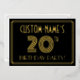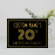 The front of this vintage-appearance and 1920s-1930s style inspired twentieth birthday party/celebration foil invitation features a customisable name, a large art deco style inspired number “20TH”, the message “BIRTHDAY PARTY!”, and a border pattern consisting of lines. The background of the front is coloured black by default, but it can be customised to a different colour if desired. The back features personalised details about the event, such as the date, time, location, and any other relevant information. Elegant, luxurious, customisable invitations like these might be used to invite guests to a birthday celebration/party being held in celebration of somebody’s 20th birthday. [~Z0000590]
