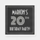 This stylish and 1920s-1930s style inspired twentieth birthday celebration/party paper napkin design features a personalised name, a fancy art deco style inspired number “20th”, the message “BIRTHDAY PARTY!”, and a multi-line border. It has a black-coloured background by default, but it can be customised to a different colour, if desired. Birthday themed paper napkins like these might be used at a party celebrating somebody’s twentieth birthday. [~Z0000616]