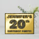 The front of this bold twentieth birthday party/celebration foil invitation card features a customisable name, a large number “20th”, the message “BIRTHDAY PARTY!”, and a border, all featuring a rustic, yet sophisticated, faux wood grain appearance inspired pattern. The back features personalised details about the event, such as the date, time, venue/place, and any other information that may be useful. Personalised invitations like these might be used to invite attendees/guests to a birthday party being held to honour somebody’s 20th birthday. [~Z0000595]