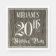 This elaborate and elegant birthday-themed paper napkin design features a customisable name and the message “20th Birthday Party”. The large number “20th” and the words “Birthday Party” are in ornate script-style text. The background features an imitation/faux woodgrain-inspired pattern. Ornate, fancy paper napkins like this might be useful to have at a birthday celebration being held to honour somebody’s 20th birthday. [~Z0000564]