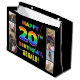 This cheerful and joyful birthday themed gift bag design features the message “HAPPY 20TH BIRTHDAY,“ with a multicolored rainbow spectrum inspired gradient pattern, along with an editable recipient name. The photos to the left and the right of the rainbow-patterned message on the front of the card can be personalised, perhaps with photos of the recipient, the recipient’s family and friends, and/or the sender(s) of the gift. A upbeat giftbag like this might be used when wrapping presents being given to somebody in celebration of their twentieth birthday. (Photography © Storytree Studios, Stanford, CA.) [~Z0000668]