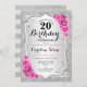20th Birthday Invitation. Elegant design in silver and pink. Features faux glitter silver stripes, pink roses stylish script font and confetti. Perfect for a glam birthday party.