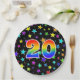 This fun, colourful, and cheerful paper plate design features a large number "20" containing a rainbow spectrum gradient inspired pattern. The background features a colourful star shapes pattern. Fun paper plates like this might be used at a celebration being held in honour of somebody’s twentieth birthday, or a couple’s 20th anniversary, or some other 20th event. [~Z0000493]
