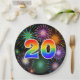 This cheerful, colourful, and fun paper plate design features a large number "20" having a rainbow spectrum gradient inspired pattern colouring. It also features a exciting and vibrant bursting celebratory fireworks inspired pattern. The background is coloured black. Fun paper plates like this might be used at a celebration being held in honour of somebody’s twentieth birthday, a twentieth anniversary, or some other 20th event. [~Z0000490]