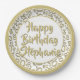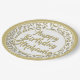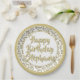 This numeric design has a black and gold random number pattern with a gold milestone number 20 repeated in varied sizes and angles. There is a white circle in the centre for your text and gold-and-white rings around the rim.