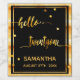 Elegant and modern for a 21st birthday party. Black backdrop and faux gold text written with a trendy han-lettered style script: hello twentyone With faux golden dots as decor. Templates for name and date, golden letters. You can change the background colour to match your theme. Click customise and then "select a background colour" on your right.