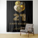 A tapestry for a glamourous 21st birthday party. A black background, decorated with balloons. With the text: Happy Birthday. Personalise and add a name. The name is written in dark rose gold with a modern hand lettered style script with swashes. Number 21 is written with a trendy balloon style font, leopard pattern. To keep the swashes only delete the sample name, leave the spaces or emoji's in front and after the name. Can be used as a welcome banner, wall decor for the party or as a photo booth backdrop.