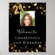 A welcome poster for a girly and glamourous 21st birthday party. A black background decorated with faux gold stars. Personalise and add a name.