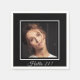 An elegant and chic black and white frame and template for your photo. White text: Hello 21! A napkin for a stylish 21st birthday party.