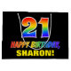 This colourful, cheerful, and fun birthday-themed gift bag design features a large number "21" and the message "HAPPY BIRTHDAY,", both having a rainbow spectrum gradient inspired pattern colouring, along with a bold yellow personalised recipient name. The background is coloured black. A fun gift bag like this might be used when wrapping gifts being given to somebody in celebration of their twenty first birthday. [~Z0000477]